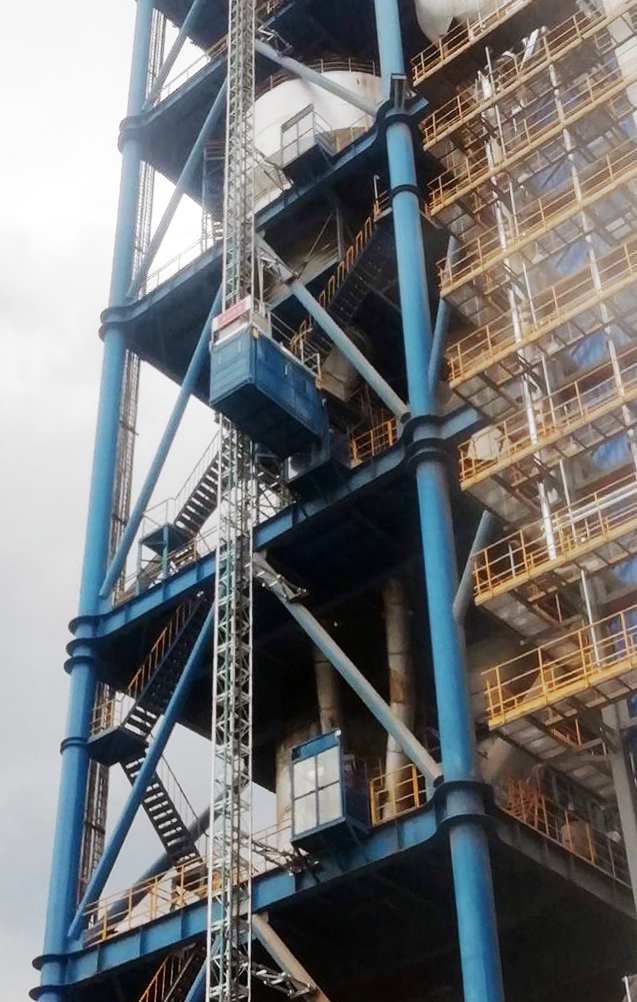 根據用戶要求和現場的安裝空間,對工業升降機的轎廂尺寸和運行速度,進行了定制。由于使用環境高溫、多塵,轎廂采用了封閉結構,在側板和轎廂門上設有觀察視窗,轎廂內設有通風系統、照明和應急照明系統。驅動機構采用了防護等級較高的德國NORD公司產品。采用了自主研發的控制技術,配備智能化控制系統,可自動選平層,實現無人駕駛,具有停層精度高、等待時間短、運行效率高的特點。特別提供了應急安全自救系統,在設備故障或斷電情況下,乘員在轎廂內操縱該系統可實現迅速自救。主要結構件采用熱鍍鋅處理,防腐效果好,提高了整機環境適應性,延長了使用壽命。